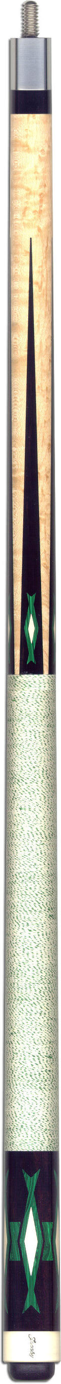 | Jacoby custom pool cue with a birdseye maple forearm with five ebony points. Each point has a micarta diamond inlays inside of a fancy malachite inlay. The butt is ebony with large micarta diamond inlays inside of fancy malachite inlays with five malachite inlays. The wrap is white with green spec irish linen. The joint is stainless steel with a piloted 5/16 x 14 pin. This custom cue comes with one 13mm shaft and free shipping in the US.* - Sold |