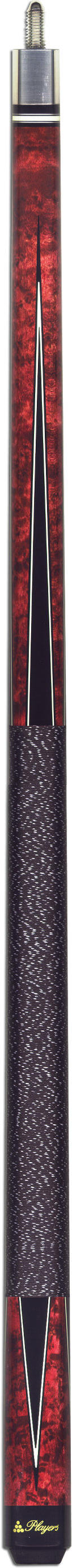 Players pool cue with a red stained birdseye maple forearm with points and veneer graphics. The butt is the reverse of the forearm. The wrap is black with white spec irish linen. The joint is stainless steel with 5/16 x 18 pin. Three are two sets of white and silver rings. This pool cue comes with one shaft with a 13mm pro taper and a Le Pro leather tip. |